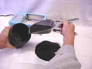 | At the end of a couple of hours stop the mill. Lay out a sheet of paper (newspaper will work fine). Open the lid to the barrel, and dump the entire contents (lead balls and all) into a spaghetti strainer over your sheet of paper. The strainer will catch the lead balls and with a little shaking, all the black powder will filter through onto your paper sheet. When black powder is in a fine "dust-like" state like this, it is called "meal powder." The meal powder you've just made can now be used as-is in a variety of formulas and projects. By adding a little water and dextrin to it, you can easily make black match fuse or quickmatch. See our section on making Black Match Fuse & Quickmatch. |