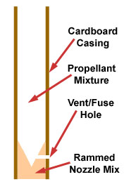 What the tooling does is form a cavity of heat-resistant Rocket Nozzle Mix at the bottom of the tube. With the rocket nozzle mix cavity in place, the flame and hot gasses pass through the small vent hole in it, which they cannot burn through, so the hole stays at 1/8" all through the flight. See the illustrations below: