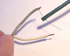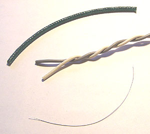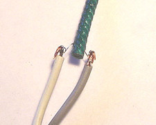 | The nichrome/fuse igniter is easy to make from available materials, and has the extra safety advantage of a short delay produced by the fuse. This is the best igniter to use for smaller black powder type ( Estes or homemade) rocket motors. The materials needed for the nichrome wire/fuse igniter are: a short length of Visco Safety Fuse, about 1.5" of nichrome wire, and some insulated wire. You can use just about just about any type of insulated wire (speaker wire, alarm hook-up wire, etc.; all available at Radio Shack or your local hardware store). Stranded wire is generally easier to work with, and much more flexible than solid wire. It's best to use wire no thinner than 20 gauge. If you plan on running the wires a long distance like 20 or 50 feet for launching model rockets, etc., then 16 gauge or 14 gauge wire would be better. The lower the wire gauge number is, the thicker the wire, and the less power it will take to fire the igniter. |
