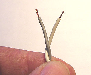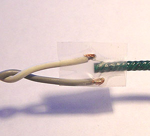 | Finally, fold a piece of tape over the connections so it protects them and prevents them from touching each other. When power is applied to the opposite ends of the wire, the small piece of nichrome will heat up, glow red hot, and ignite the fuse. Depending on how long your wires are, and how thick the wire you used is, as little as 3 volts (2 flashlight batteries) will be sufficient to make the igniter work. Long lengths of wire may require as much as 12 volts, and very long runs may require even more. |