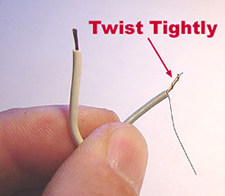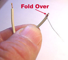 | Twist the nichrome wire tightly around one of the wires and fold over so it is secure. |