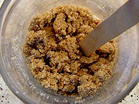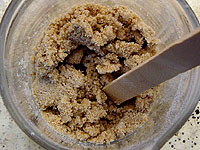 | Over the next several minutes, the mixture will begin to darken and clump. It will soon begin to look like brown sugar, and when it finally mixes smoothly and looks like peanut butter, it is done. If your mixture is turning BLACK, you're heating it at too high of a temperature. |