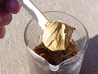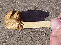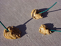 | Remove the container from the heat and scoop out a lump of the sticky mass. You can either just plop some on the concrete, or if you're picky about the way your smoke bombs look, you can make small cardboard molds and press the gooey mass into them. Personally, we just lay it on the concrete. |